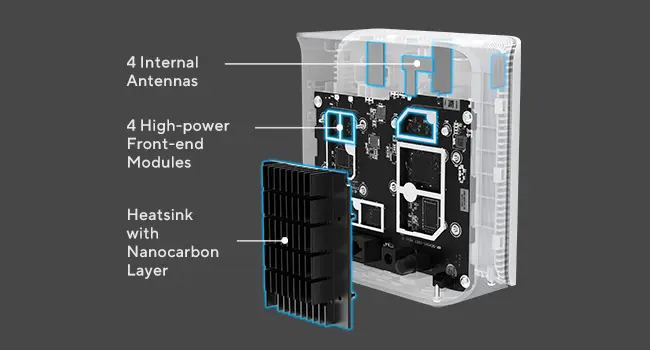 Quatre antennes internes et quatre modules frontaux haute puissance éliminent les zones mortes WiFi, offrant une couverture uniforme dans toutes les directions. La dissipation thermique efficace maintient un fonctionnement silencieux pour des performances améliorées et une fiabilité durable.
