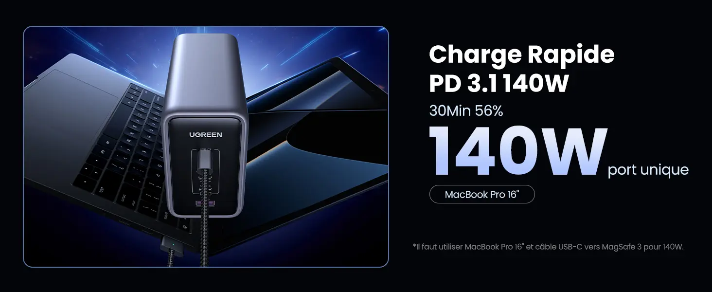 Il faut utiliser MacBook Pro 16" et USB-C avec prise en charge PD3.1 pour 140W
