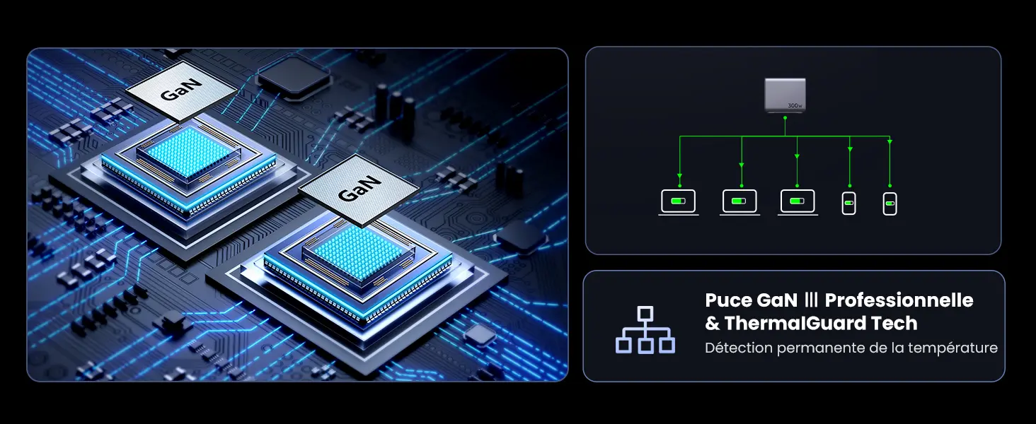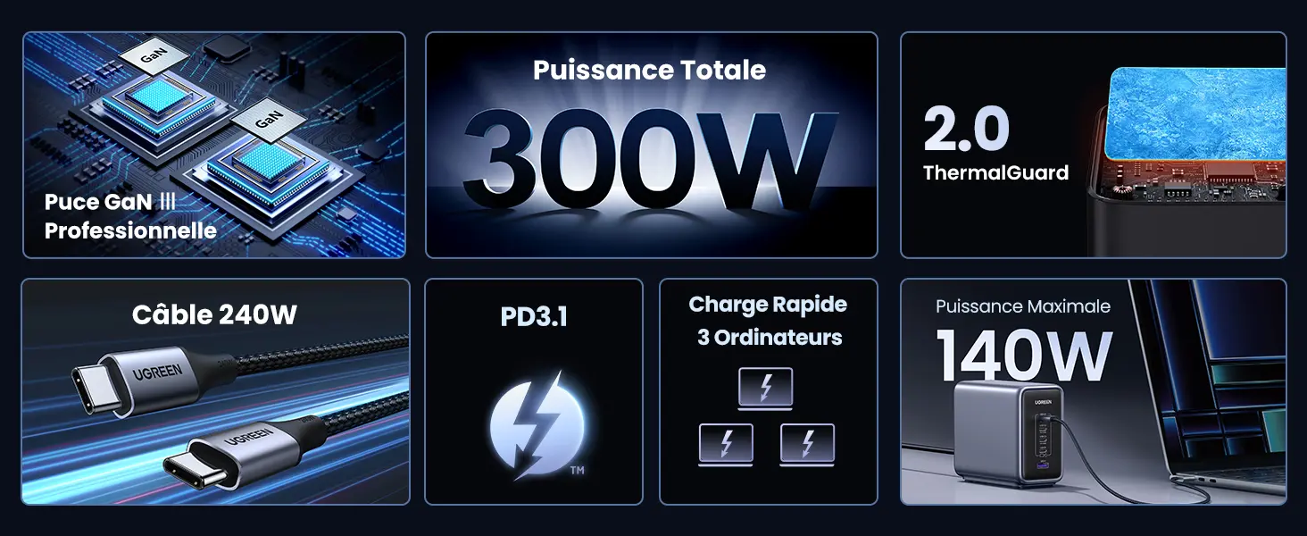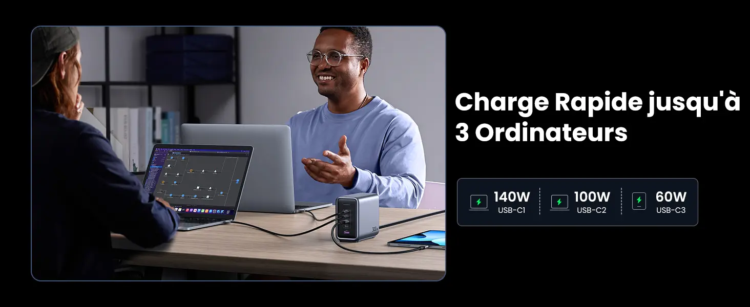 Trois ports USB-C sont utilisés simultanéments, USB-C1, USB-C2 et USB-C3 supportent jusqu'à 300W (140W + 100W + 60W)
