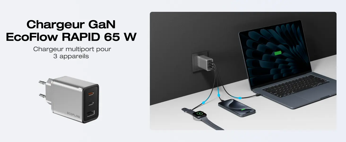 ECOFLOW Chargeur USB C Rapid 65 W GaN avec câble