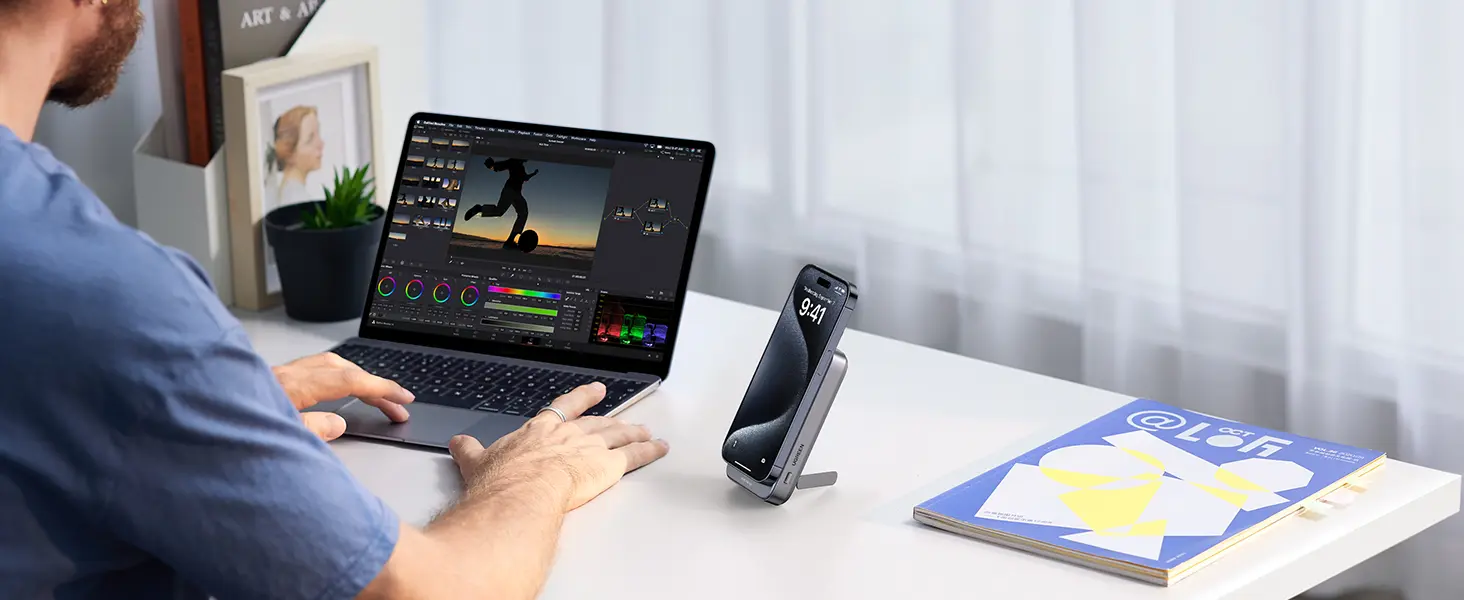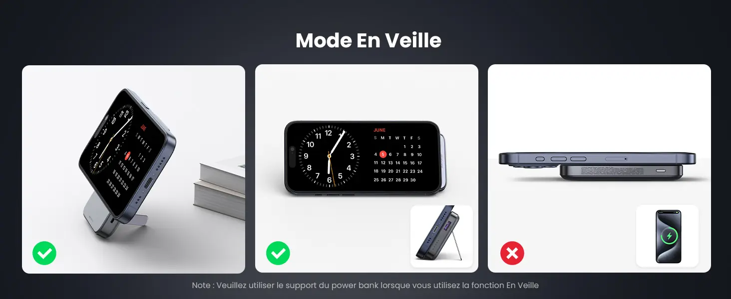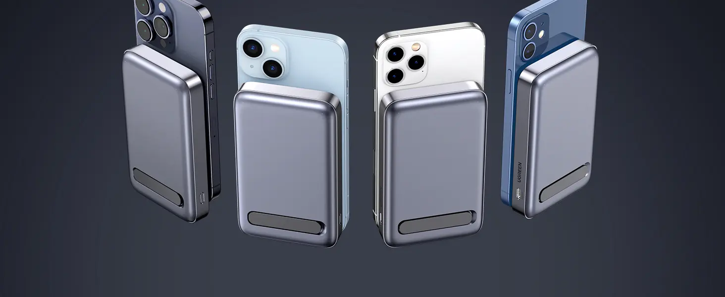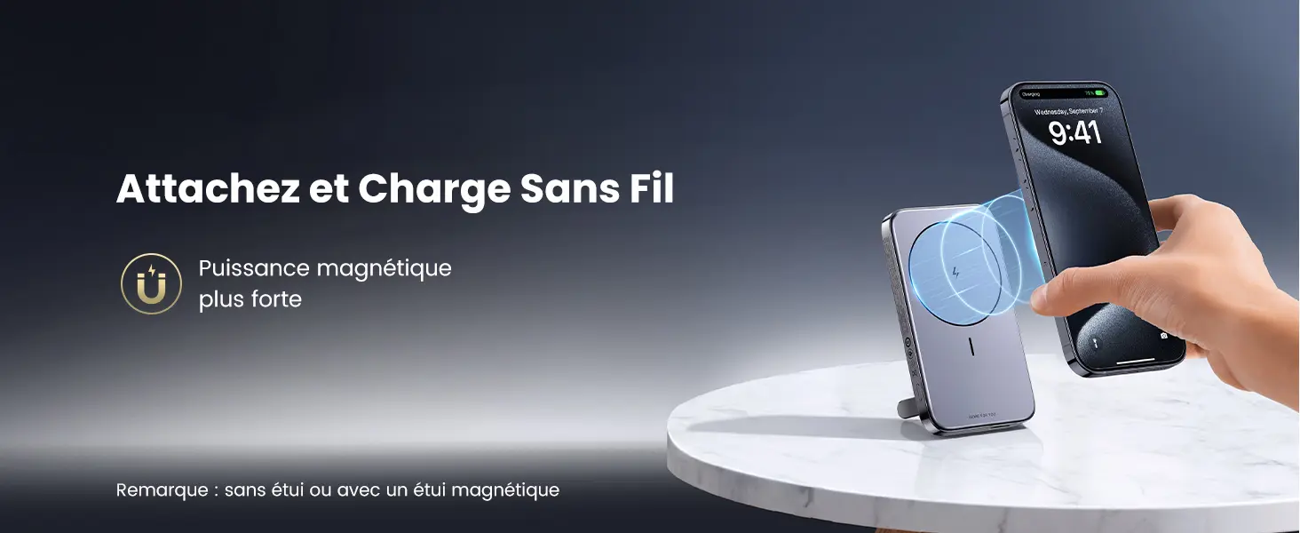Placez simplement l'iPhone sur la surface de la batterie externe, la forte attraction magnétique permet à votre iPhone de s'enclencher automatiquement sur le power bank sans utiliser le câble. Cette batterie externe induction est toujours attachée au dos de votre iPhone, ce qui vous permet de passer des appels vidéo ou de prendre des selfies d'une seule main.
