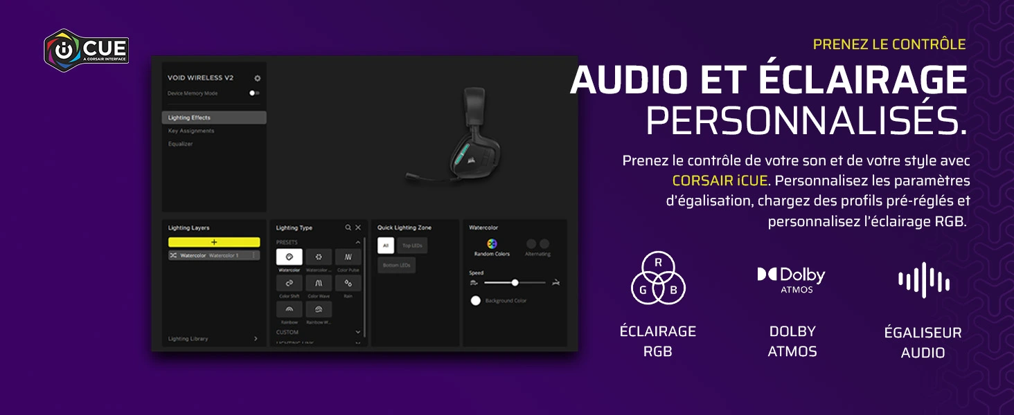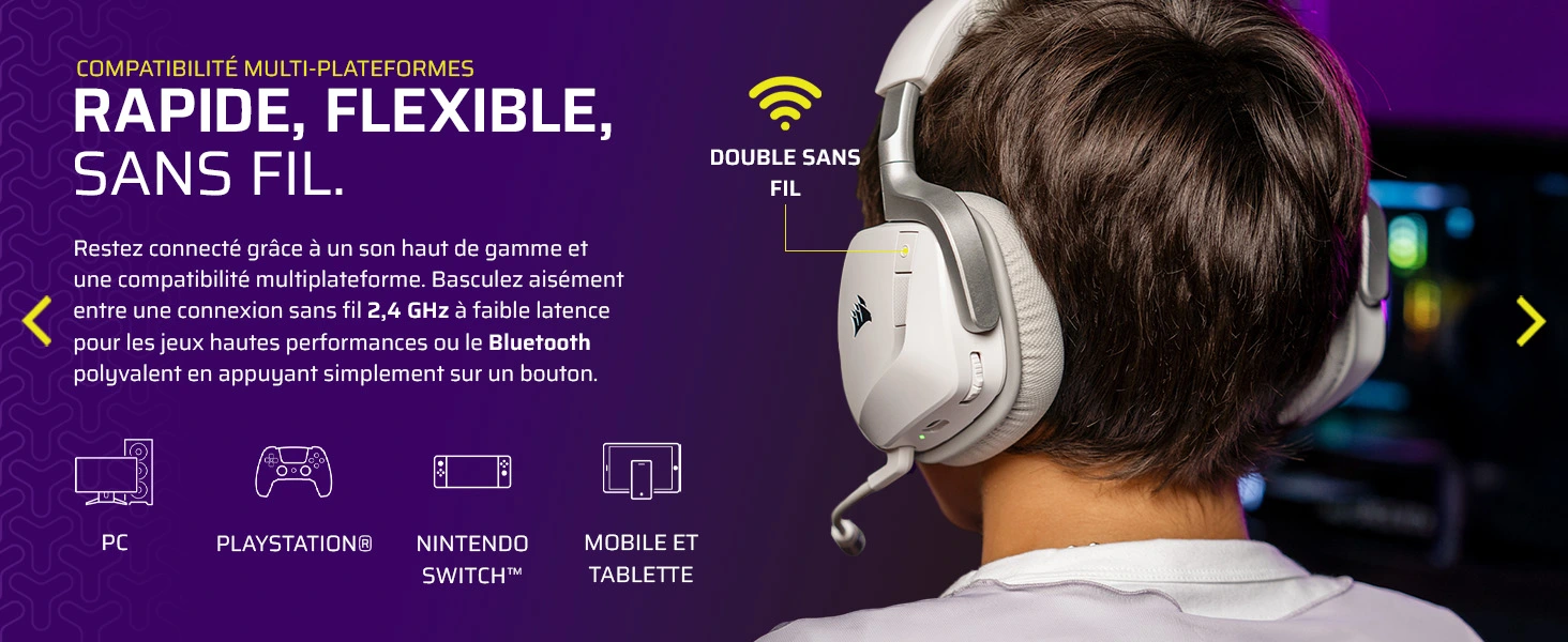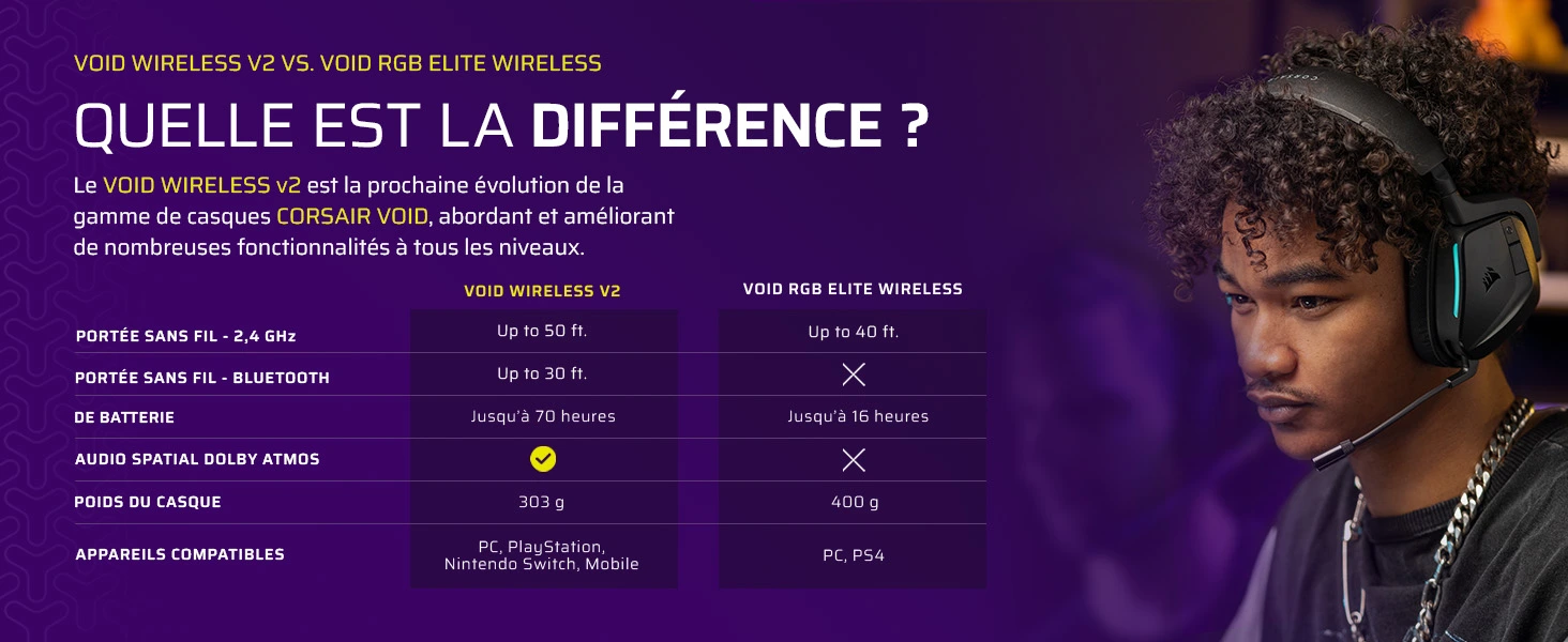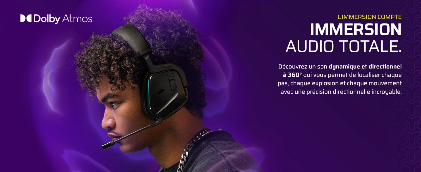 Avec le casque Corsair Gaming VOID RGB ELITE Surround Wireless v2, vous entrez dans le monde du VOID. La nouvelle famille novatrice et pleine de surprises des casques de jeu avancés de Corsair. Grâce à la connexion sans fil RF 2.4 GHz ou Bluetooth, restez immergé dans un univers sonore exceptionnel sans vous encombrer de câbles.