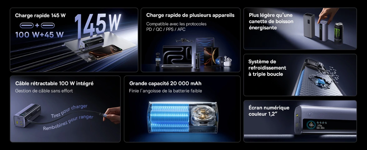 - Charge rapide et protections intégrées