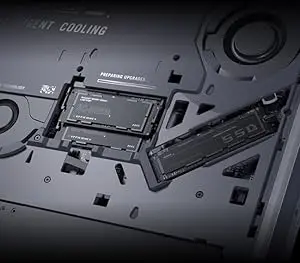 Nous avons entièrement repensé le Strix G16 2025 pour simplifier les mises à niveau. Cette conception sans outil permet un accès facile à la RAM, au SSD et aux ventilateurs, et nous avons également intégré notre tout dernier système Q-Latch aux emplacements SSD. Tel un mécanicien expérimenté, vous pouvez retirer et remplacer votre SSD et votre RAM en quelques secondes, et remettre la machine en état de marche sans perdre un seul tour.
