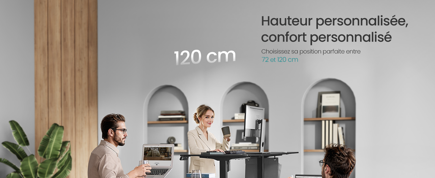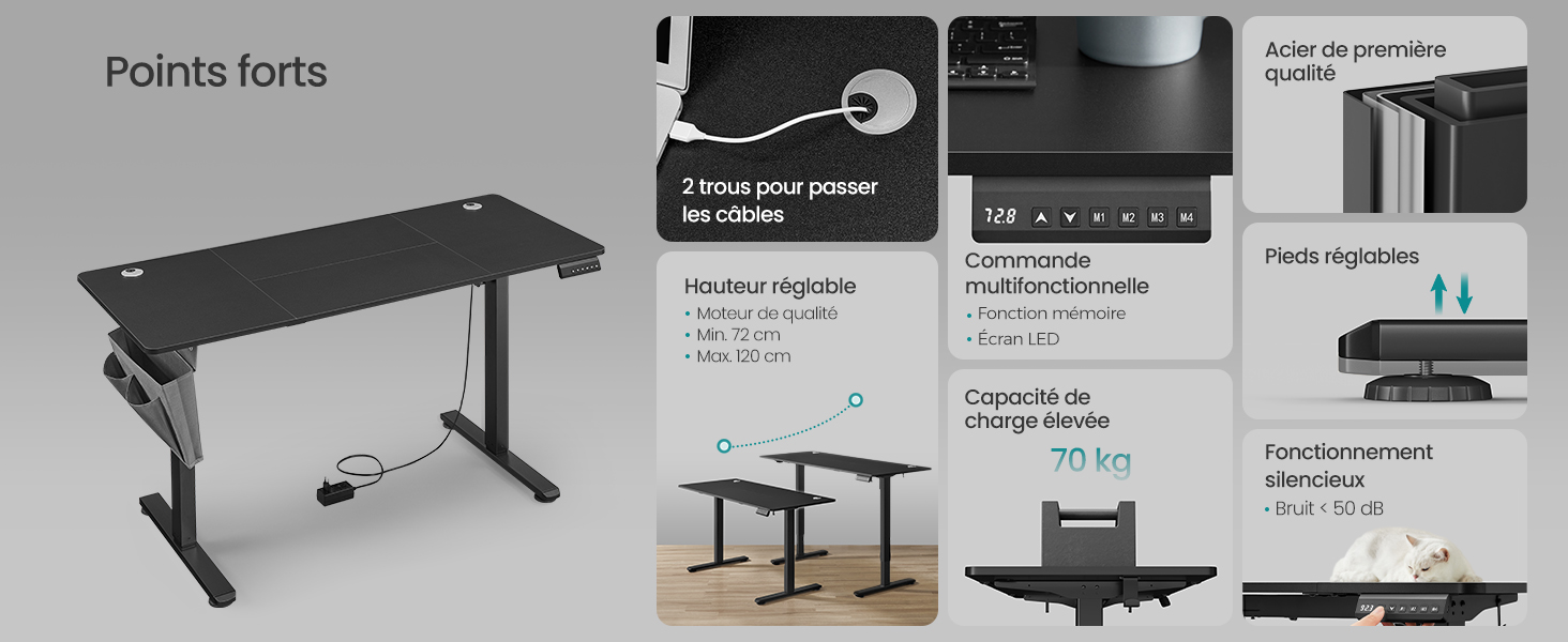 Ce bureau réglable en hauteur est votre partenaire de travail idéal ! Son grand plateau de 140 x 60 cm vous offre beaucoup d’espace pour être super productif. Sa hauteur réglable de 72 à 120 cm vous permet d’alterner facilement la position assise et debout selon vos besoins, et de trouver la position de travail optimale. La fonction mémoire avec 4 réglages vous permet d’enregistrer vos hauteurs préférées. Le cadre en acier robuste et le moteur de qualité font monter et descendre le bureau rapidement et en douceur, avec un niveau sonore inférieur à 48 dB, sans vous déconcentrer de votre travail ni vous distraire. Il intègre aussi 2 ouvertures pour les câbles, une pochette de rangement et un crochet pour garder tout bien rangé sur votre bureau.