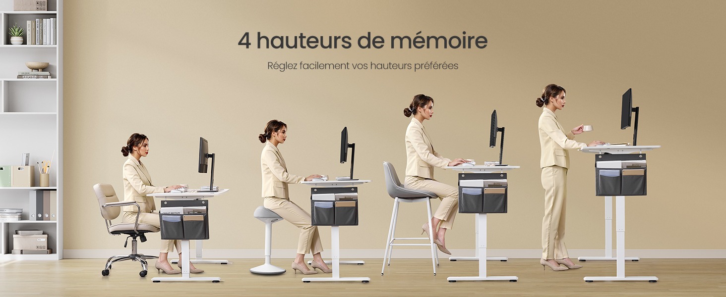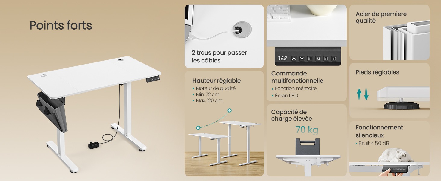 Ce bureau réglable en hauteur est votre partenaire de travail idéal ! Son grand plateau de 120 x 60 cm vous offre beaucoup d’espace pour être super productif. Sa hauteur réglable de 72 à 120 cm vous permet d’alterner facilement la position assise et debout selon vos besoins, et de trouver la position de travail optimale. La fonction mémoire avec 4 réglages vous permet d’enregistrer vos hauteurs préférées. Le cadre en acier robuste et le moteur de qualité font monter et descendre le bureau rapidement et en douceur, avec un niveau sonore inférieur à 48 dB, sans vous déconcentrer de votre travail ni vous distraire. Il intègre aussi 2 ouvertures pour les câbles, une pochette de rangement et un crochet pour garder tout bien rangé sur votre bureau.