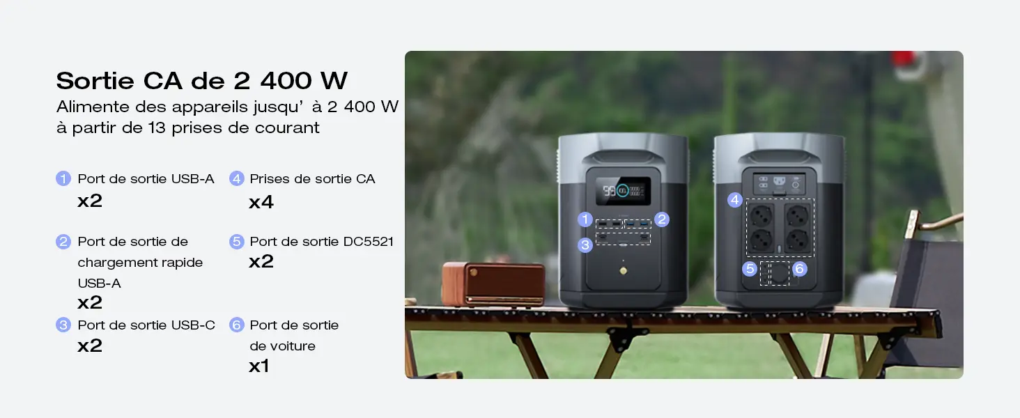 | Sortie AC | 2400W( 4800W en crête) - 3 100 W avec X-Boost |