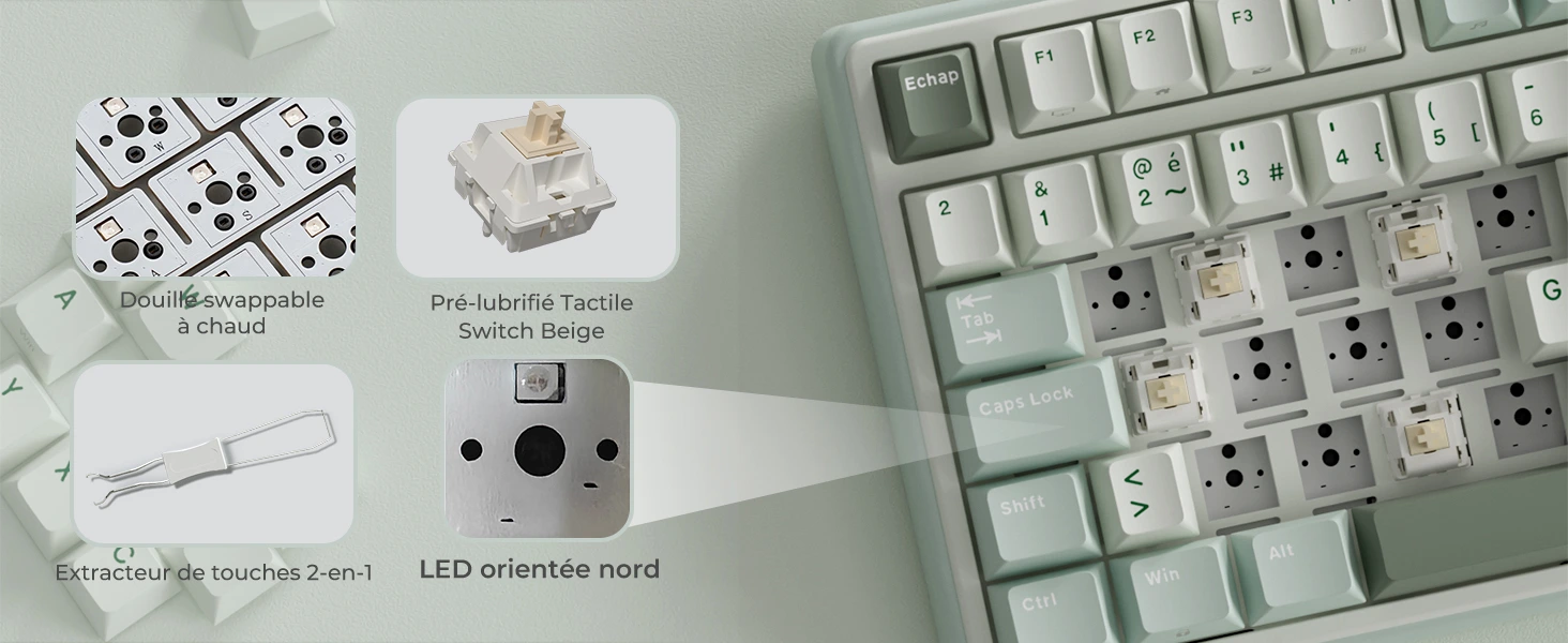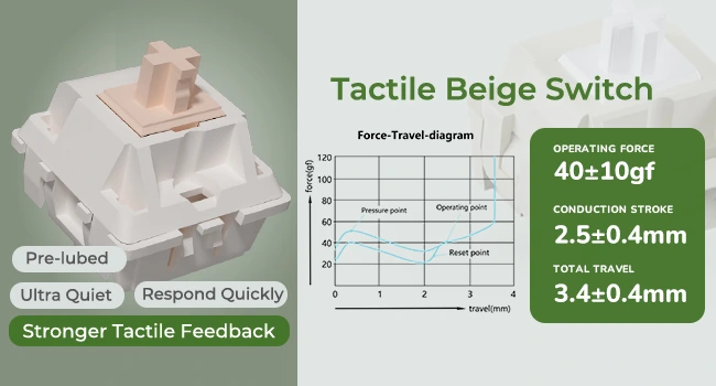 Les interrupteurs tactiles Beige pré-lubrifiés, conçus sur mesure, offrent une réponse rapide et un retour tactile net. Idéaux pour les rédacteurs et passionnés recherchant une expérience de frappe unique