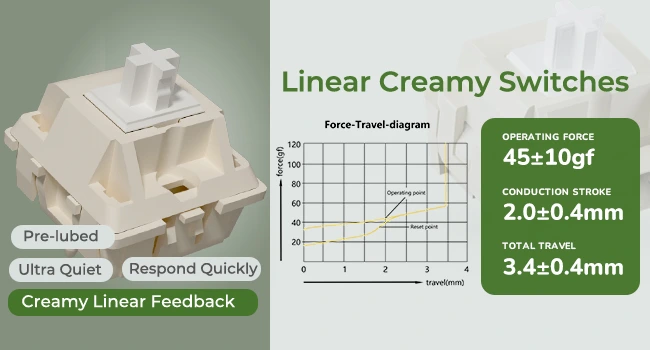 Les interrupteurs linéaires Creamy pré-lubrifiés sont appréciés pour leur esthétique unique, leur son crémeux et leur glisse exceptionnelle. Leur sonorité caractéristique offre une expérience de frappe agréable.