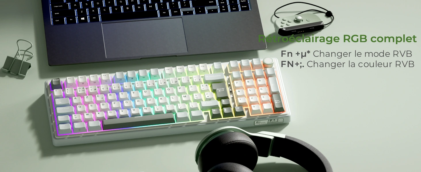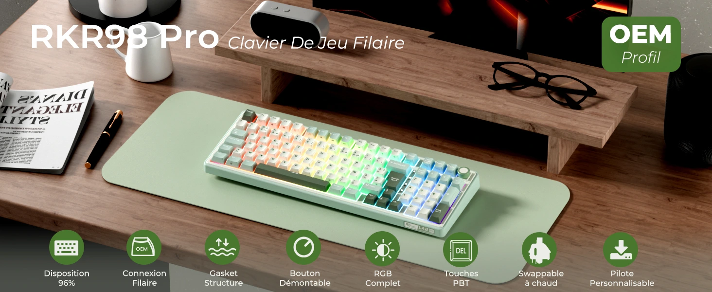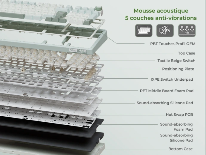 Le RKR98 Pro adopte une gasket structure qui optimise l'élasticité et la stabilité des touches. Cinq couches de mousse acoustique absorbent 90% de la résonance creuse et réduisent le bruit de 50%, garantissant une frappe douce et un son crémeux caractéristique.